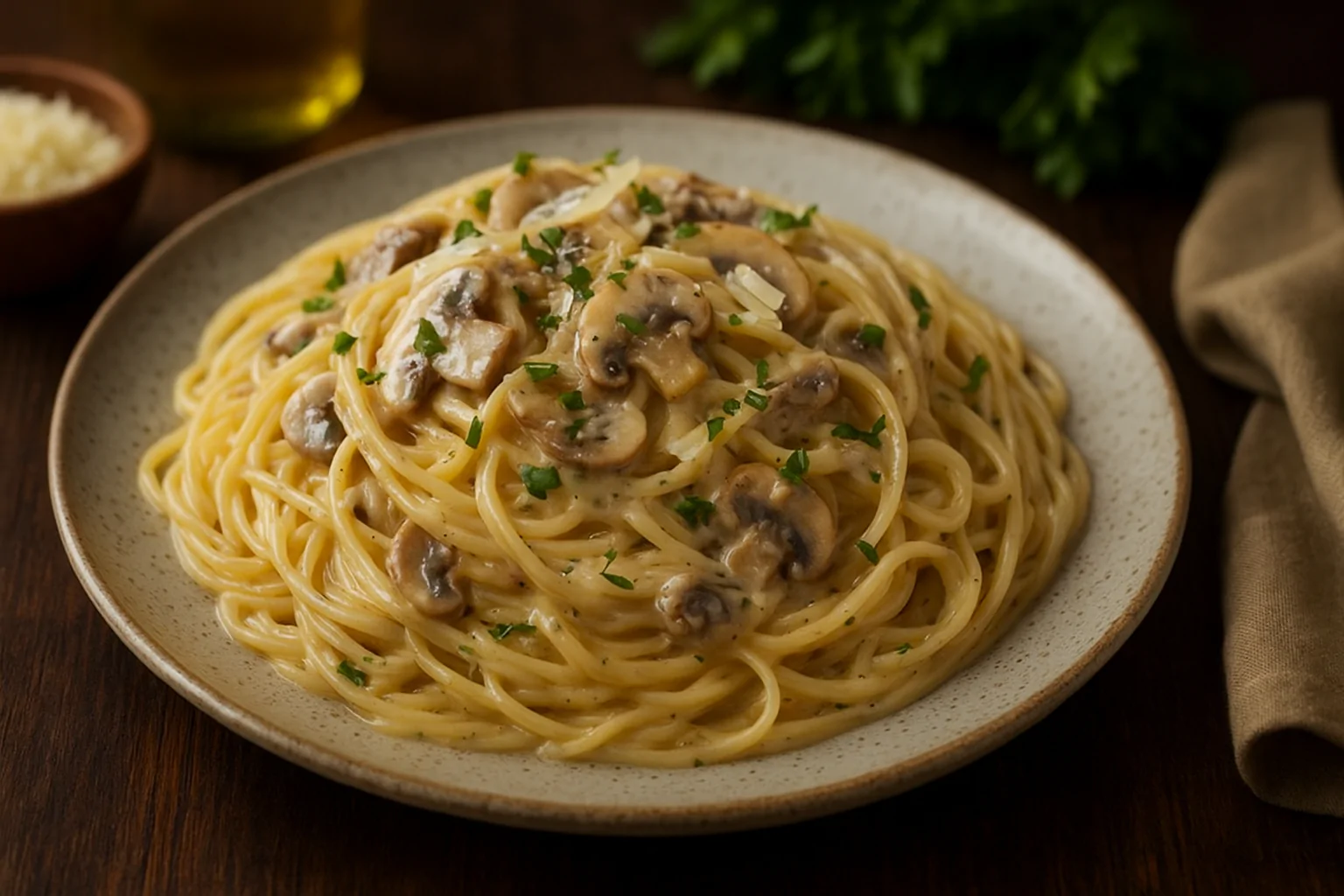 Sirva em pratos fundos de cerâmica, com um fio de azeite e lascas de parmesão por cima. O visual cremoso e o aroma de cogumelos frescos vão conquistar todos à mesa. 🍽️