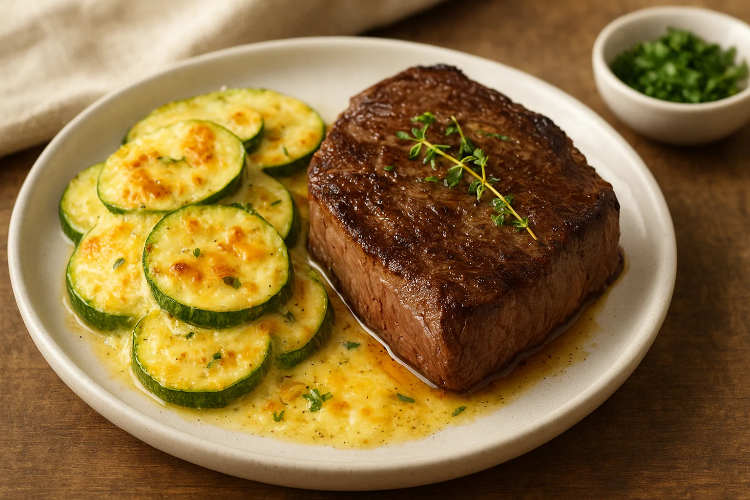 Sirva o Beef Ancho ao lado de uma porção do gratinado de abobrinha dourado. Finalize com ervas frescas e um toque de azeite extra virgem.