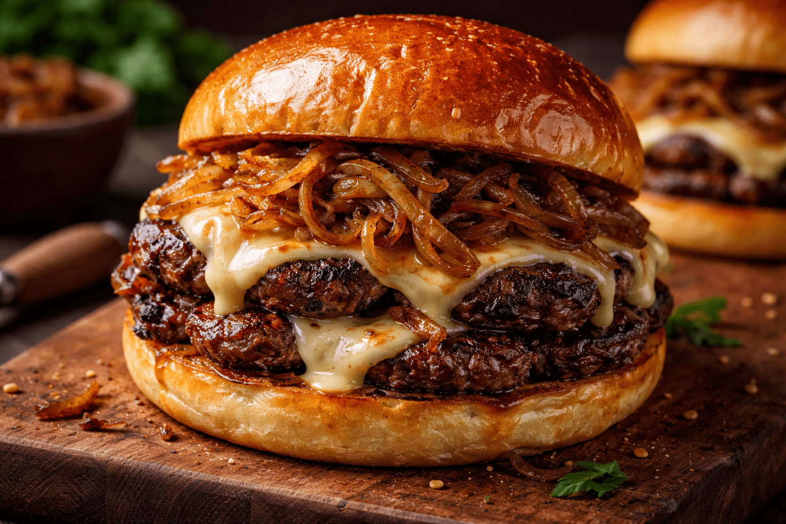 O French Onion Smash é a fusão perfeita entre o clássico smash burger americano e a icônica sopa de cebola francesa.